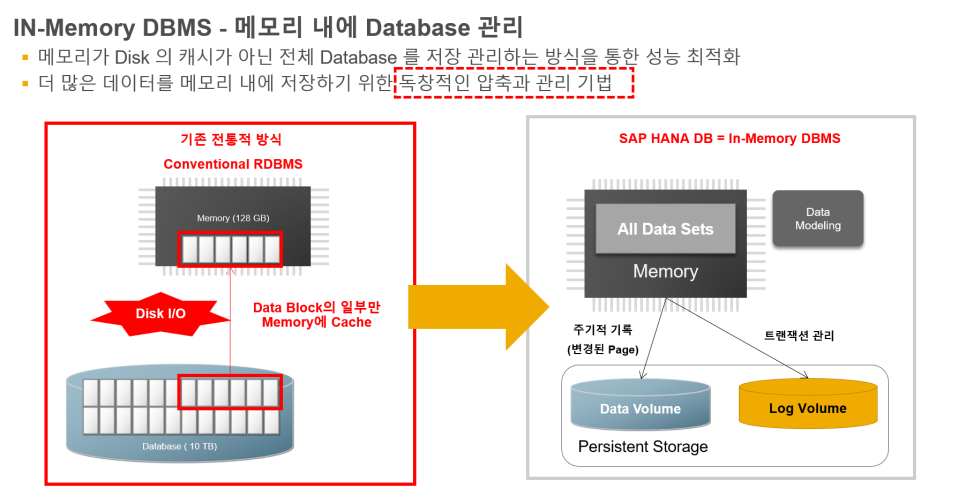 SAP HANA(In-Memory) 데이터베이스 관리 기술 디스크의 일부를 메모리에 캐싱하지 않고 전체 데이...